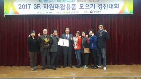 안성시새마을회(회장 이용우)는 지난 13일 새마을중앙연수원에서 새마을운동중앙회가 주최하고, 행정안전부가 후원한 ‘2017 전국 3R 자원재활용품 모으기 경진대회’에 참가하여 전국 최우수 수상의 영예를 차지했다.