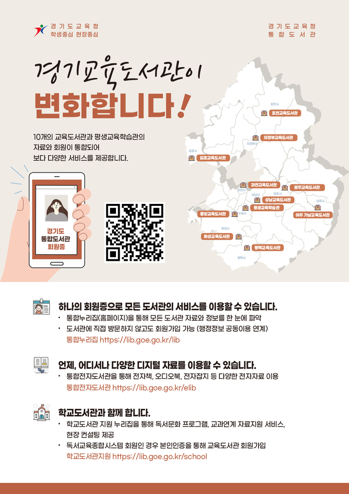 통합정보시스템(https://lib.goe.go.kr/lib)은 그동안 교육도서관별로 제공한 서비스를 통합해 도서 검색과 대출, 독서문화 프로그램 등을 한 번에 살펴 이용할 수 있는 사용자 중심 정보 시스템으로 휴대전화 등에서도 이용할 수 있다.