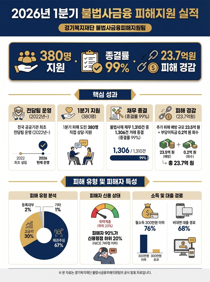 경기복지재단(대표이사 이용빈) 불법사금융피해지원팀이 2026년 1분기 총 380명의 피해 도민을 지원하고 1,310건의 불법사금융 채무에 직접 개입해 1,306건을 종결 처리(종결률 99%), 23.5억 원 규모의 추가 피해를 예방해 단순 상담을 넘어선 ‘직접 개입형’ 공공 대응의 실효성을 입증했다.