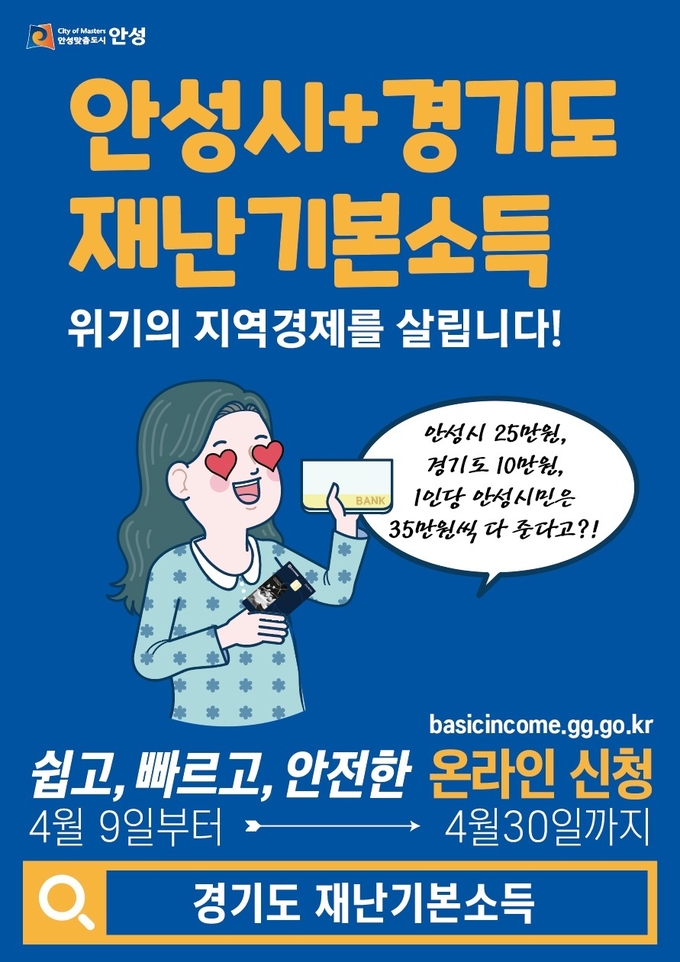 재난기본소득은 지역화폐(안성사랑카드)와 신용카드, 선불카드 등 모두 3가지 형태로 지급받을 수 있으며, ‘경기도 재난기본소득신청 홈페이지(basicincome.gg.go.kr)’를 통해, 4월 9일부터 30일까지 지역화폐와 신용카드 접수가 먼저 시작된다.