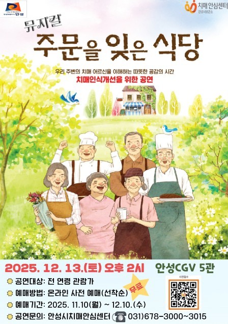 안성시보건소 치매안심센터가 오는 12월 13일 오후 2시, 안성 CGV에서 치매에 대한 올바른 이해와 공감 확산을 위한 치매인식개선 뮤지컬 ‘주문을 잊은 식당’공연을 무료로 개최한다.