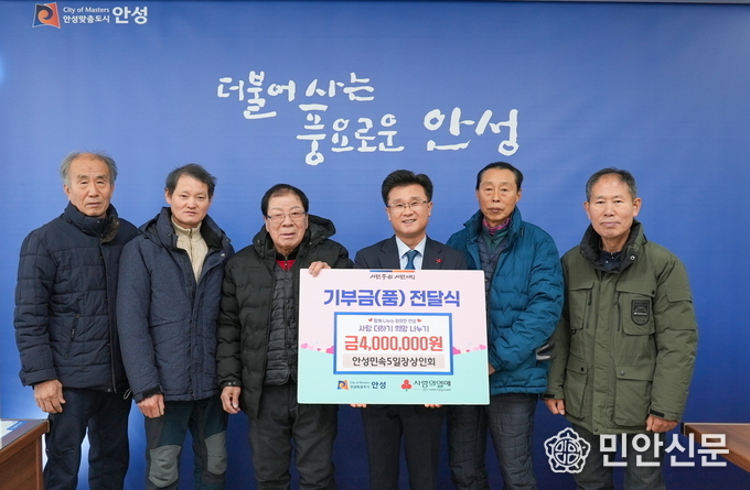 민속오일장 상인회(대표 임문식)가 지난 8일 이웃돕기 성금 400만을 안성시에 기탁했다. 전달식에는 상인회 임원진과 시 관계자가 참석한 가운데 진행됐다.