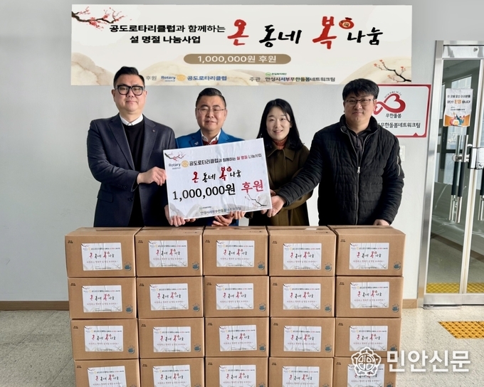 사회복지법인 한길복지재단(이사장 한창섭)이 수탁 운영하는 안성시서부무한돌봄네트워크팀(센터장 유성아)은 공도로타리클럽(회장 김영구)과 지난 12일 설 명절 나눔사업 ‘온동네 복나눔’ 후원금 100만 원 전달식을 가졌다.