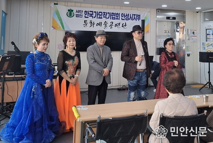 (사)한국가요작가협회안성시지부(지부장 이종국) 문화예술공연단이 25일 오후 2시 안성시 최대 규모 시설인 대덕면 소재 청춘주간보호센터를 방문, 노래 봉사로 시설 노인들을 즐겁게 했다.