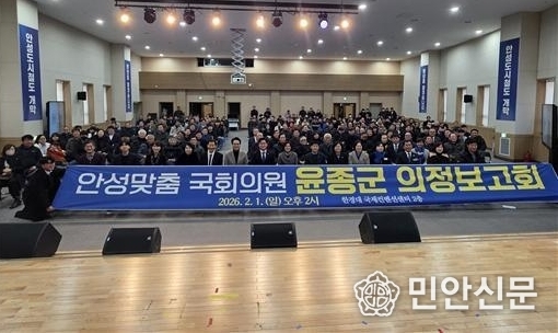 더불어민주당 윤종군 국회의원(안성시)이 지난 1일 한경국립대학교 국제컨벤션센터에서 의정보고회를 열고 2025년 의정활동과 지역 현안 성과, 2026년 안성 발전 핵심 과제 등을 발표했다. 이날 행사에는 약 800여 명의 주민이 참석해 열기를 더했다.