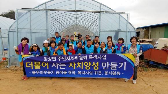 한편 양성면 주민자치위원회는 매년 복지시설 위문 및 봉사활동, 관내 행사 공연 찬조, 환경정화 활동 등 지역주민을 위한 다양한 활동을 전개하고 있으며, 농작물 경작으로 얻는 수입은 전액 불우이웃돕기에 사용할 예정이다.
