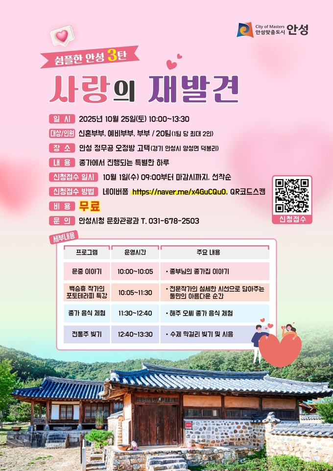 전통과 현대가 어우러지는 이번 행사는 안성의 문화유산 힐링프로그램 ‘쉼플한 안성’ 시리즈의 마지막을 장식하는 특별한 시간이다. 그동안 이어온 쉼과 여유의 여정을 마무리하며, 부부가 함께 서로의 마음을 다시 확인하고 오래도록 간직할 소중한 추억을 만들어가는 순간이 될 것으로 기대된다.