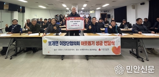 박노성 보개면장은 “지역 발전을 위해 늘 힘써주시는 이장님들이 있어 2026년 한해도 풍성하고 알차게 보낼 수 있을 것 같다.”며 “기탁받은 성금은 기부에 참여해 주신 이장님들의 소중한 마음을 담아 관내 어려운 이웃들에게 잘 전달하겠다.”고 답했다.