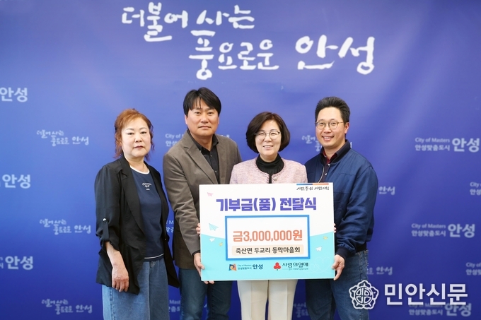 죽산면 두교리 동막마을회(대표 강승률)가 지역사회 발전과 복지 증진을 위해 현금 300만 원을 안성시에 기부해 찬사를 받고 있다.