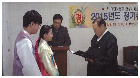 충효·예절교실 우수학생 시상 김태원 회장은 지난 2월 13일 오전 10시에 열린 노인회 총회에서 2014년 동절기 충효·예절교실에서 우수한 학생(백성초 6학년 박다현, 백성초 5학년 최경훈)에게 표창장을 수여하며 “열심히 공부해 지역과 사회발전의 주역이 될 것” 을 당부했다. |