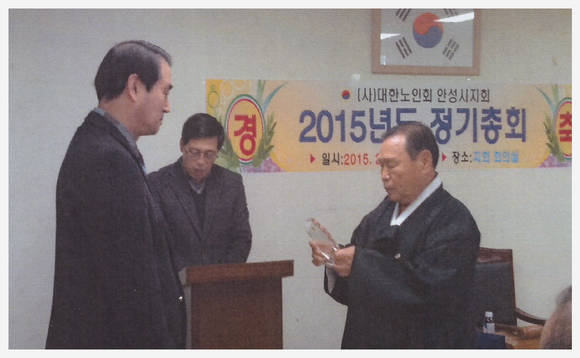 노인복지 증진 위상 향상 도모 ‘대한노인회 안성시지회’ 정기총회 사회발전 봉사로 존경받는 노인상을 구현한 분회장과 사무장들 (사)대한노인회 안성시지회(회장 김태원 이하 안성시노인회) 2015년 정기총회가 지난 2월 13일 오전 10시부터 지회 회의실에서 황은성 안성시장, 지회 임원과 각 읍·면·동 분회장 및 사무장 등이 참석한 대성황 속에서 개최됐다. 김태원 회장은 인사말에서 “노인인구가 급속한 증가와 안성에서도 수년전 100세 장수노인이 6명 정도였는데 지난해 말 현재 16명으로 큰 폭으로 늘어났다” 면서 “그래서 인생 100세라는 말이 실감할 정도인데 그에 걸맞게 건강생활과 노령기를 보람 있게 보낼 수 있도록 사회봉사에도 참여해 가정과 사회의 어른으로서 항상 솔선수범하는 자세로 우리가 지난 날 어려운 환경 속에서도 지켜온 바른 덕목과 체험한 고귀한 경험과 열정으로 존경받는 노인이 되도록 노력해줄 것” 을 당부했다. 황은성 안성시장은 “어르신들은 어려운 여건 속에서도 국가와 사회를 수호하고 발전시키면서 자녀들을 훌륭히 키워 일제의 수탈과 6·25전쟁으로 폐허가 된 나라를 세계 10대 경제대국으로 만든 업적을 갖고 있다” 면서 “안성시도 어르신들을 경해하고, 복지향상을 통해 노후를 안락하게 보낼 수 있도록 계속 노력 할 것” 임을 약속해 큰 박수를 받았다. |