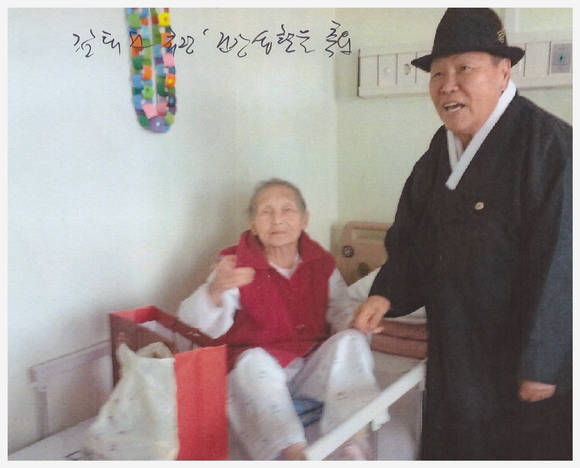▲보개면 마노요양병원에서 102세 김계녀 장수노인을 만나 담소하고 있는 김 회장 민족의 대 명절인 설날을 맞아 동방예의지국의 상징인 효의 근본을 새롭게 인식케하고, 경로효친 사상을 앙양하기 위해 지난 2월 10일 김태원 회장이 직접 100세 넘는 장수노인을 일일이 찾아뵙고 건강을 기원하고, 준비해간 선물도 증정했다. 안성시에는 현재 16명의 장수노인이 있는데 계속 증가추세에 있다. |