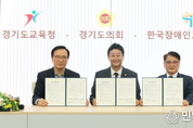 경기도의회(의장 김진경)는 24일 의회 예담채에서 경기도교육청, 한국장애인고용공단과 업무협약식을 열고, 도내 장애인의 고용증진에 함께 힘을 모으기로 했다. 이날 업무협약식에는 김진경 의장과 임태희 교육감, 이종성 장애인고용공단이사장이 각 기관을 대표해 참석했고, 국민의힘 지미연·정경자 의원과 임채호 의회사무처장도 함께해 그 의미를 더했다. 세 기관은 협약을 통해 장애인 일자리를 지속적으로 창출하고, 사회적 가치를 실현하기 위해 협력하기로 했다. 이를 위해 공단은 장애인 고용가능 직무 발굴 등 고용컨설팅 제공, 장애인 교원 임용 준비반 운영 지원 등에 나서고, 도교육청은 장애인 의무고용률 달성을 위해 적극 노력하기로 했다. 도의회는 교육청의 장애인고용 현황 점검 및 필요사항 지원과 적극적인 예산 지원, 연계고용 활성화 지원 등에 노력하고, 도교육청 및 공단과 함께 장애인 고용확대 TF를 운영하기로 했다. 김진경 의장은 “크리스마스이브인 오늘, 경기도의회와 경기도교육청, 한국장애인고용공단의 협약이 경기도에 온기를 더하는 아름다운 약속이 되기를 바란다”며 “함께 맞잡은 손이 희망의 사다리가 되고, 차별 없는 동행이 올바른 이정표가 될 것”이라고 기대했다. 이어 “