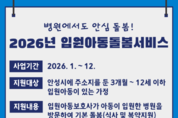 안성시가 아동이 입원한 병원에 ‘입원아동보호사’를 파견하는 입원아동돌봄서비스를 올해에도 계속 운영, 안정적인 돌봄 지원을 이어간다고 밝혔다. 입원아동돌봄서비스는 아동의 장기 입원이나 갑작스러운 입원으로 돌봄 공백이 발생했을 때 아동이 입원한 병원으로 입원아동보호사를 파견해 식사 및 복약 지원 등의 돌봄서비스를 제공하는 사업이다. 이에 따라 전년도와 동일하게 아동이 입원한 병원의 위치와 관계없이 안성시에 주소지를 둔 아동(3개월~12세 이하)을 대상으로 지원하며, 이용요금은 시간당 최소 1,400원에서 최대 7,000원으로 소득 판정 유형에 따라 차등 지원한다. 서비스를 이용한 한 보호자는 “어린 둘째 아이 때문에 집을 비울 수 없어 난감했는데 입원아동돌봄서비스를 이용할 수 있어 큰 도움이 됐다”며, “다자녀·맞벌이 가정에 꼭 필요한 사업인 것 같다”고 말했다. 서비스 신청은 수행기관인 안성시 가족센터(☎070-4284-7161) 전화 신청을 통해 가능하며, 이용요금 산정을 위한 소득 판정은 읍면동 행정복지센터로 방문 신청하면 된다. <저작권자 © 민안신문 무단전재 및 재배포금지>